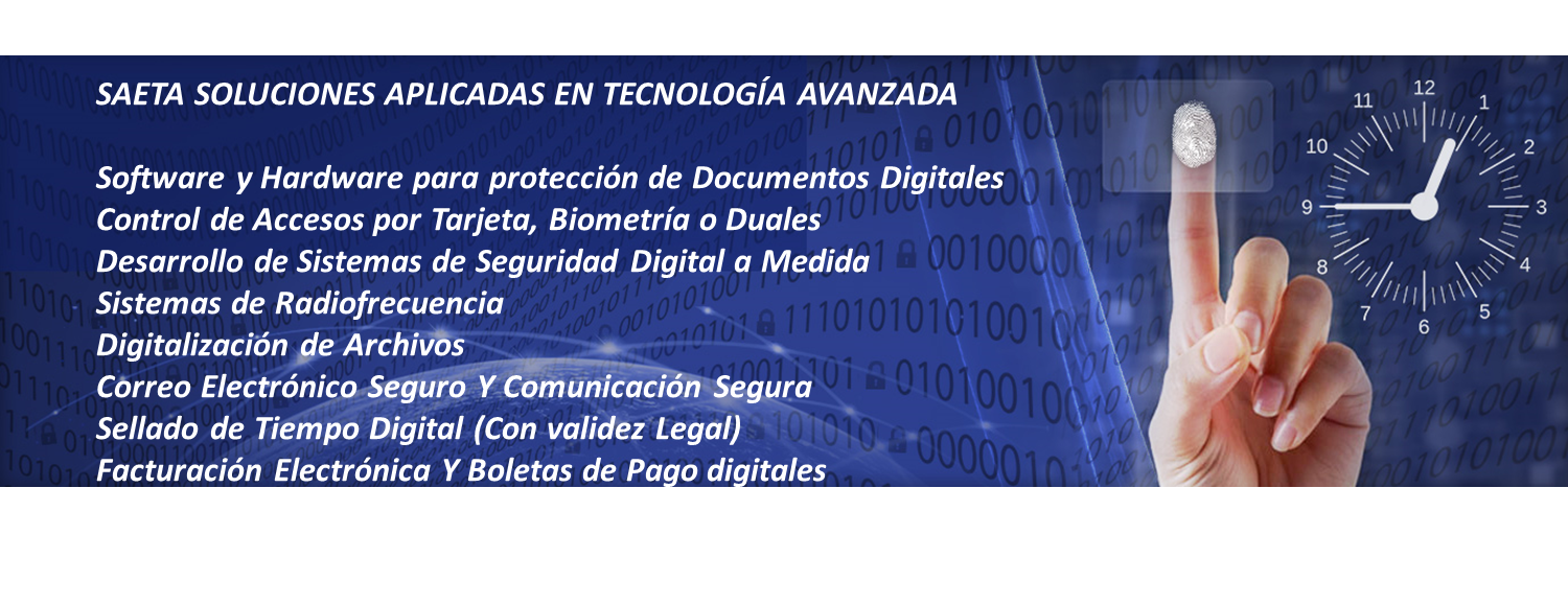 SAETA S.A.C. es una empresa que brinda soluciones de seguridad digital para proteger actividades administrativas, comerciales y de carácter personal. Brindamos consultoría y asistencia en sistemas informáticos y electrónicos, nuestras líneas de comercialización incluyen la venta de impresoras de fotochecks y carnets, en sus diferentes niveles de seguridad, equipos biométricos de control de asistencias y accesos, certificados digitales y sellos de tiempo electrónico digital, dispositivos y tags de radiofrecuencia.