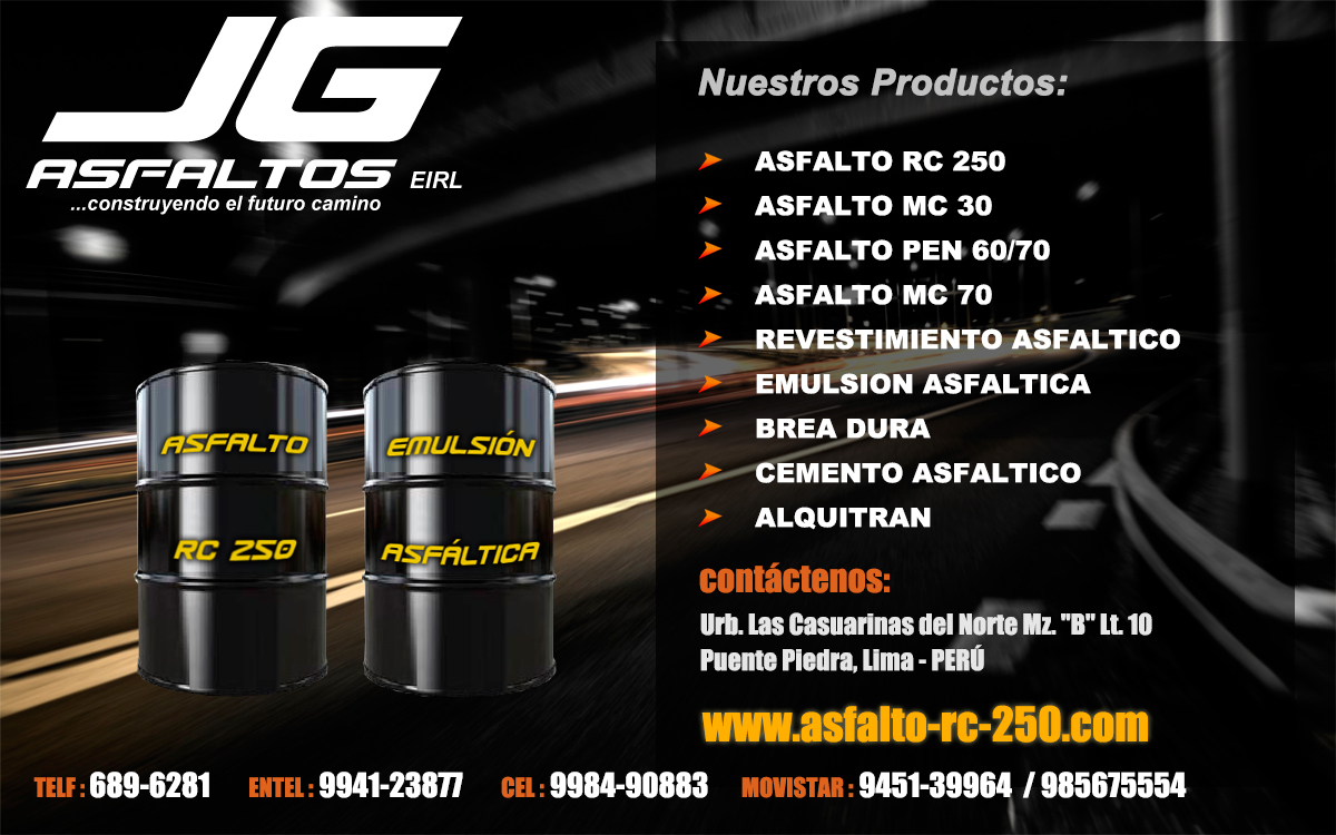 Fabricamos y distribuimos asfaltos y otros materiales derivados para la construcción de carreteras en el país. Ofrecemos productos a un mejor precio y alta calidad facilitando a nuestros clientes con entrega inmediata incluyendo a provincias. JG asfaltos EIRL. Les ofrece